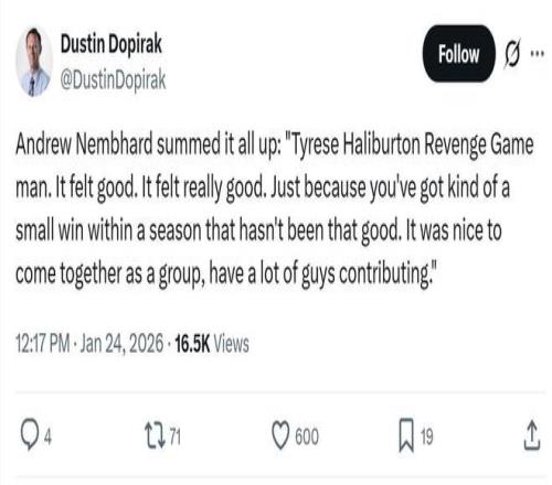本场比赛就是如此,西卡、沃克与内姆哈德均交出20+得分表现,赛后内姆哈德直言:“这是哈利伯顿复仇之战,感觉真得是太棒了!在这个赛季整体表现不佳的情况下,能够取得这样一场胜利真得太好了,很高兴大家能够齐心协力,共同努力,每个人都贡献出自己的力量。”